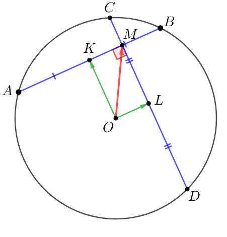 Отметим середины хорд \(\displaystyle AB\) и \(\displaystyle CD\) – точки \(\displaystyle K\) и \(\displaystyle L\small.\) Чтобы решить задачу: