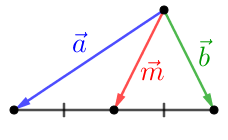Вектор медианы треугольника равен полусумме векторов его сторон, выходящих из той же вершины: \(\displaystyle \vec{m}=\frac{\vec{a}+\vec{b}}{2}\small.\) |