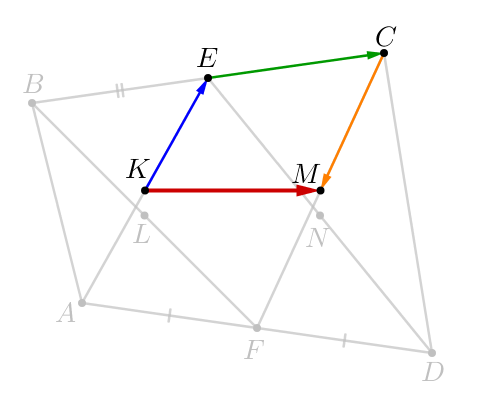 | \(\displaystyle \overrightarrow{KM}=\overrightarrow{KE}+\frac{\overrightarrow{BC}}{2}+\overrightarrow{CM}\small.\) | ![]() |