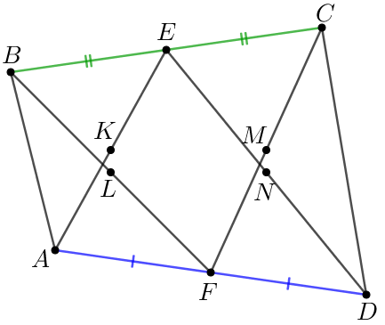 В четырёхугольнике \(\displaystyle ABCD\) точки \(\displaystyle E\) и \(\displaystyle F\) — середины непараллельных сторон \(\displaystyle BC\) и \(\displaystyle AD\small.\) Точки \(\displaystyle K,\,L,\,M,\,N\) – середины отрезков \(\displaystyle AE,\,BF,\,CF\) и \(\displaystyle ED\) соответственно.