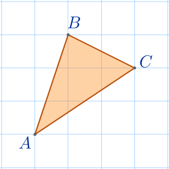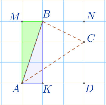 \(\displaystyle \color{blue}{1)}\) Найдём площадь треугольника \(\displaystyle ABC\) в клетках.