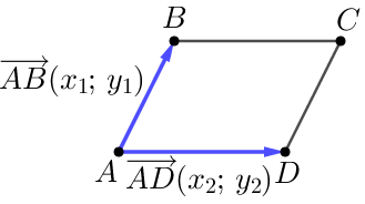 Запишем площадь параллелограмма, образованного векторами \(\displaystyle \overrightarrow{AB}(x_1,y_1)\) и \(\displaystyle \overrightarrow{AD}(x_2,y_2){\small:}\)