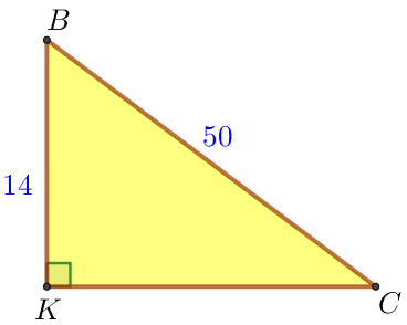 | По теореме Пифагора \(\displaystyle BC^2=KC^2+BK^2 {\small,}\) \(\displaystyle KC^2=BC^2-BK^2 {\small,}\) \(\displaystyle KC^2=50^2-14^2=2500-196=2304=48^2 {\small.}\) Так как длина отрезка положительна, то \(\displaystyle KC=48{\small.}\) |