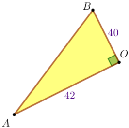 ![]() | Рассмотрим прямоугольный треугольник \(\displaystyle ABO {\small.}\) По теореме Пифагора \(\displaystyle AB^2=AO^2+BO^2 {\small,}\) \(\displaystyle AB^2=42^2+40^2 =1764+1600=3364=58^2{\small.}\) Так как длина отрезка положительна, то \(\displaystyle AB>0 {\small.}\) \(\displaystyle AB=58 {\small.}\) |