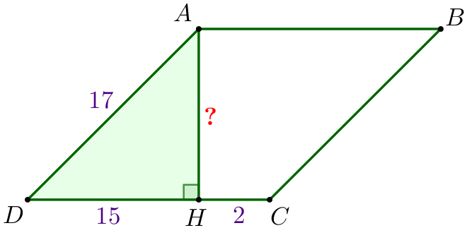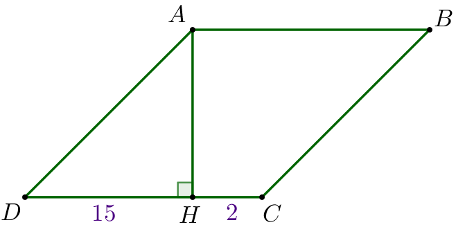 Высота \(\displaystyle AH\) ромба \(\displaystyle ABCD\) делит сторону \(\displaystyle CD\) на отрезки \(\displaystyle DH=15\) и \(\displaystyle CH=2 {\small.}\) Найдите высоту ромба.