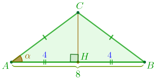 В треугольнике \(\displaystyle ABC\) известно, что \(\displaystyle AC=BC{\small , }\) \(\displaystyle AB=8\) и  \(\displaystyle \cos\angle BAC=\frac{1}{2}{\small .}\) Найдите \(\displaystyle AC{\small .}\)