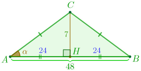 В треугольнике \(\displaystyle ABC\) известно, что \(\displaystyle AC=BC{\small , }\) высота \(\displaystyle CH=7\) и \(\displaystyle AB=48{\small .}\) Найдите \(\displaystyle \sin\angle BAC.\)