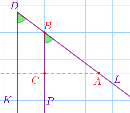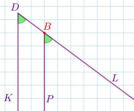 ![]() | На стороне \(\displaystyle DL\) угла \(\displaystyle KDL\) найдем точку, лежащую в узле квадратной сетки. Обозначим эту точку буквой \(\displaystyle B{\small.}\) Из точки \(\displaystyle B\) по линии сетки параллельно лучу \(\displaystyle DK\) проведём луч \(\displaystyle BP{\small.}\) \(\displaystyle \angle PBL=\angle KDL\) – соответственные углы при параллельных прямых \(\displaystyle BP\) и \(\displaystyle DK\) и секущей \(\displaystyle DL{\small.}\) |