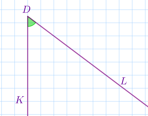 На клетчатой бумаге с размером клетки \(\displaystyle 1×1 \) изображён угол \(\displaystyle KDL{\small.}\) Найдите тангенс этого угла.