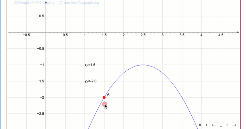 Двигая точку \(\displaystyle A\) по графику квадратичной функции \(\displaystyle y=-(x-a)^2-b{ \small ,}\) найдите параметры \(\displaystyle a,\, b\) (с точностью до десятых) и запишите уравнение параболы.