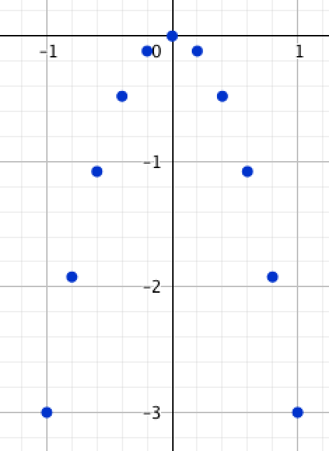 \(\displaystyle x\) | \(\displaystyle -1\) | \(\displaystyle -0{,}8\) | \(\displaystyle -0{,}6\) | \(\displaystyle -0{,}4\) | \(\displaystyle -0{,}2\) | \(\displaystyle 0\) | \(\displaystyle 0{,}2\) | \(\displaystyle 0{,}4\) | \(\displaystyle 0{,}6\) | \(\displaystyle 0{,}8\) | \(\displaystyle 1\) |