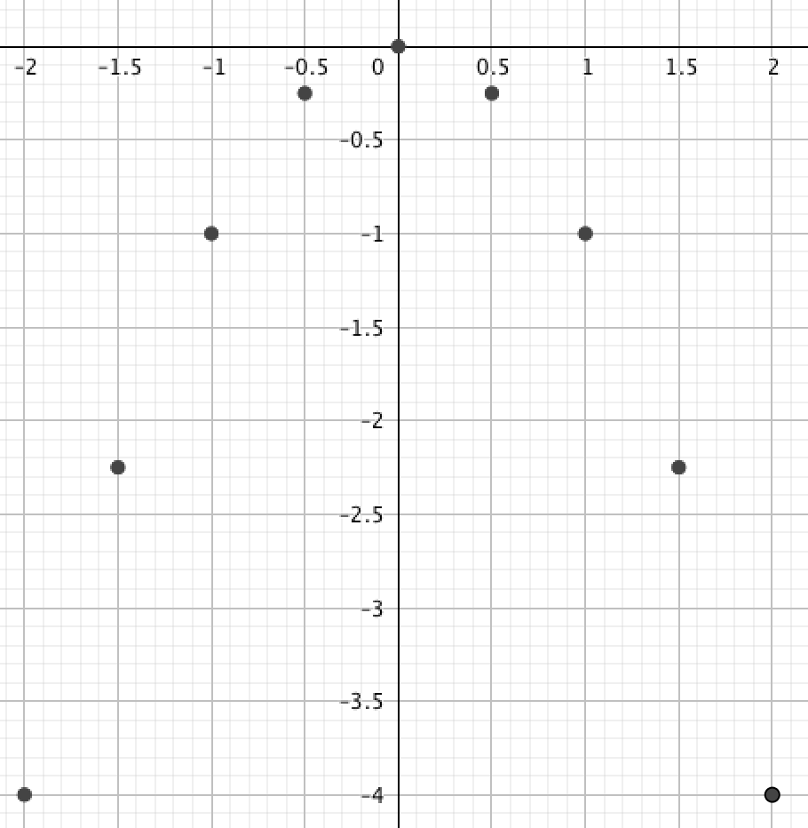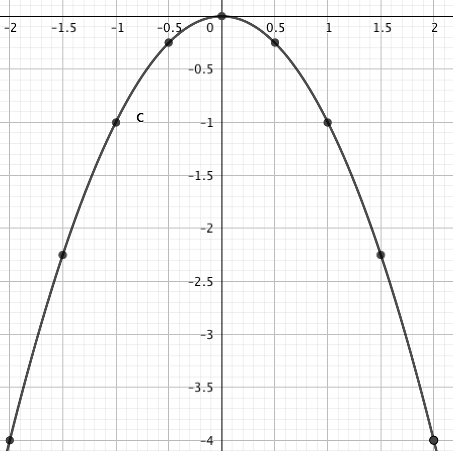 \(\displaystyle \small y=-x^2\) | \(\displaystyle -4\) | \(\displaystyle -2{,}25\) | \(\displaystyle -1\) | \(\displaystyle -0{,}25\) | \(\displaystyle 0\) | \(\displaystyle -0{,}25\) | \(\displaystyle -1\) | \(\displaystyle -2{,}25\) | \(\displaystyle -4\) |