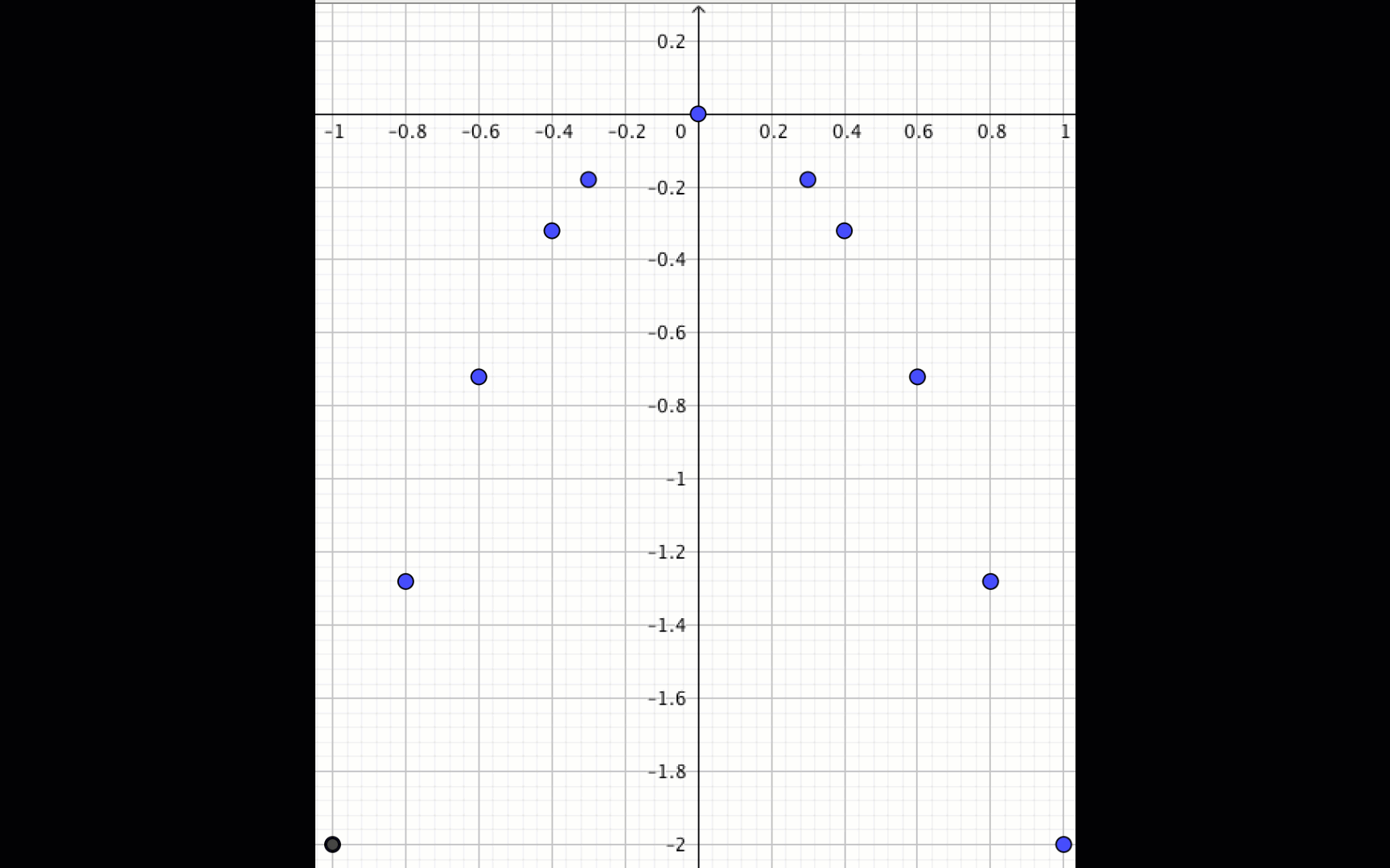\(\displaystyle x\) | \(\displaystyle -1\) | \(\displaystyle -0{,}8\) | \(\displaystyle -0{,}6\) | \(\displaystyle -0{,}4\) | \(\displaystyle -0{,}3\) | \(\displaystyle 0\) | \(\displaystyle 0{,}3\) | \(\displaystyle 0{,}4\) | \(\displaystyle 0{,}6\) | \(\displaystyle 0{,}8\) | \(\displaystyle 1\) |