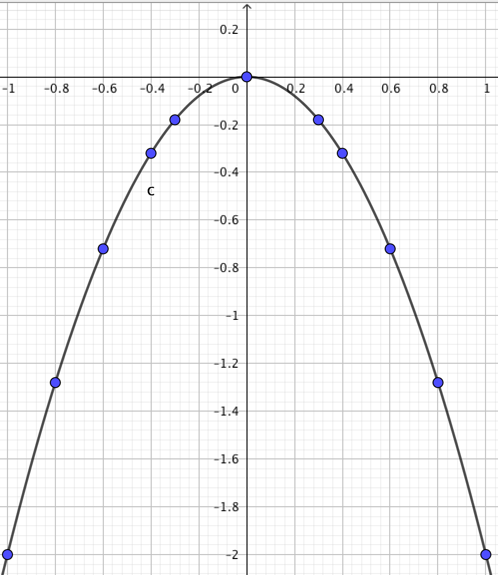 \(\displaystyle y=-2x^2\) | \(\displaystyle -2\cdot (-1)^2\) | \(\displaystyle -2\cdot (-0{,}8)^2\) | \(\displaystyle -2\cdot (-0{,}6)^2\) | \(\displaystyle -2\cdot (-0{,}4)^2\) | \(\displaystyle -2\cdot (-0{,}3)^2\) | \(\displaystyle 0\) |