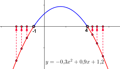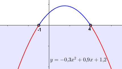 Тогда для решения неравенства \(\displaystyle -0{,}3x^2 +0{,}9x +1{,}2<0\) нужно выбрать на параболе те точки, у которых вторая координата \(\displaystyle y \) меньше нуля.