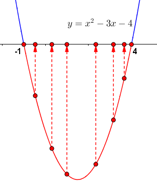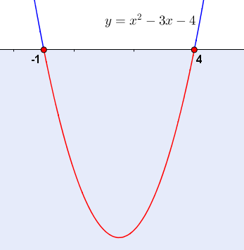 Тогда для решения неравенства \(\displaystyle x^2 - 3x -4\le 0\) нужно выбрать на параболе те точки, у которых вторая координата \(\displaystyle y \) меньше либо равна нулю.