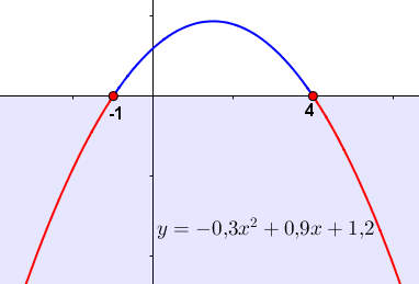 Тогда для решения неравенства \(\displaystyle -0{,}3x^2 +0{,}9x +1{,}2\le 0\) нужно выбрать на параболе те точки, у которых вторая координата \(\displaystyle y \) меньше либо равна нулю.