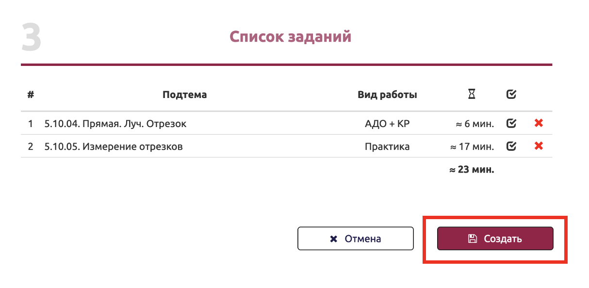 Добавленное в список задание нельзя отредактировать. Поэтому, если вы, например, решите изменить вид работы для какой-либо подтемы, которая уже находится в списке заданий, вам нужно будет удалить ее из списка (красный крестик в правой колонке таблицы) и добавить снова с нужными настройками.