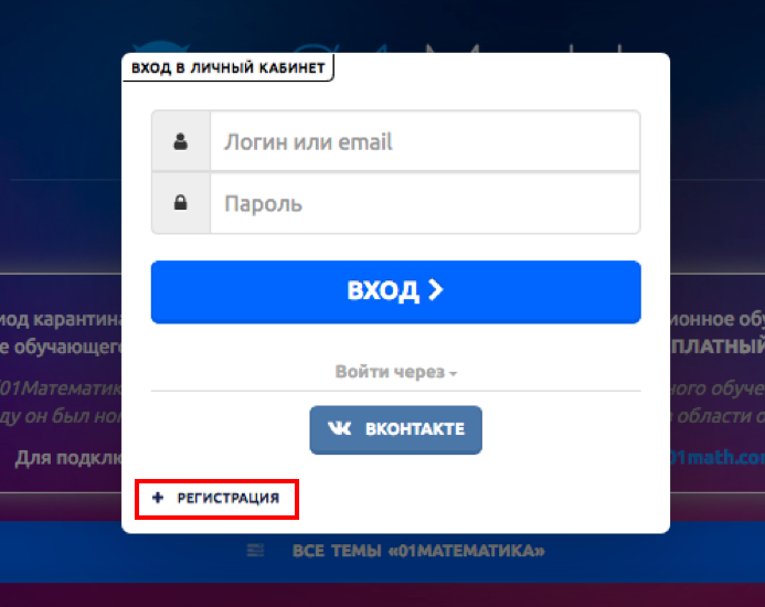 В дальнейшем вы сможете привязать к вашей учетной записи свою учетную запись "ВКонтакте" и входить на сайт "01Математика" посредством авторизации через эту социальную сеть.
